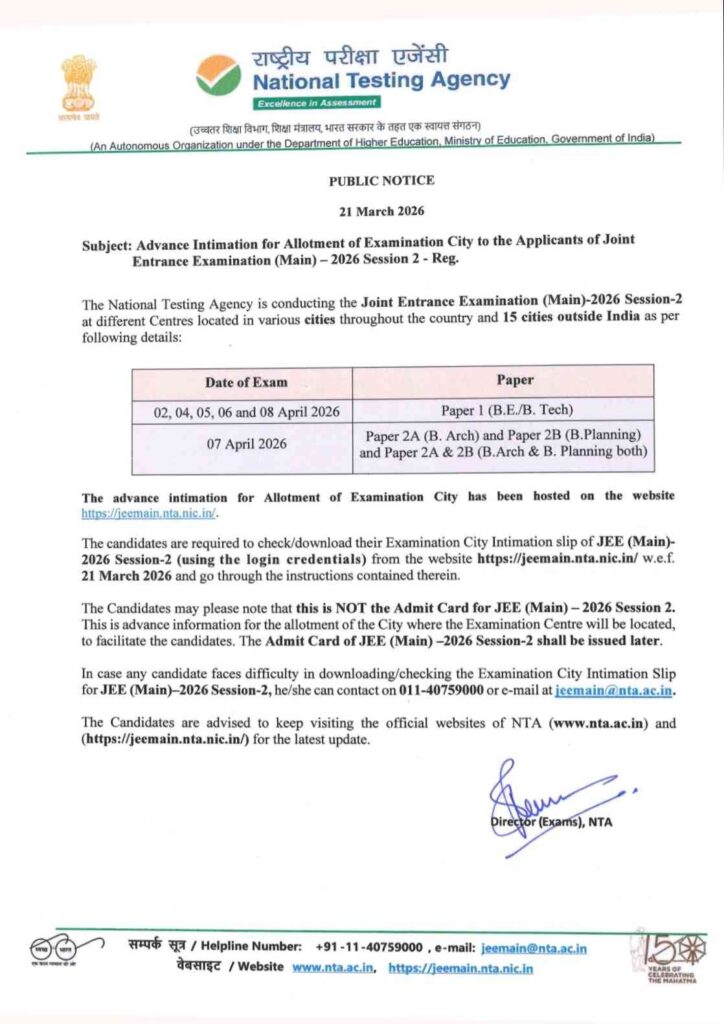 The JEE Main 2026 Session 2 is scheduled to be held between April 2 and 9, 2026. The City Intimation Slip is released on the official website on March 21, 2026, for all examinations dates, it will be followed by the admit card release 3 to 4 days before the test; all applicants can download these documents by providing their registration number and password.