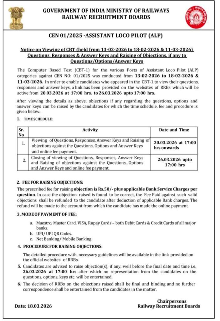 The window for raising objections will remain open for six days (untill 26 March 2026, 05:00 pm) following the release of the answer key by the Railway Recruitment Board. The ₹50 fee you submit will be refunded if the objection you have raised is found to be valid.